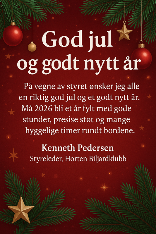 På vegne av styret ønsker jeg dere alle en riktig god jul og et godt nytt år. Må 2026 bli et år fylt med gode stunder, presise støt og mange hyggelige timer rundt bordene.