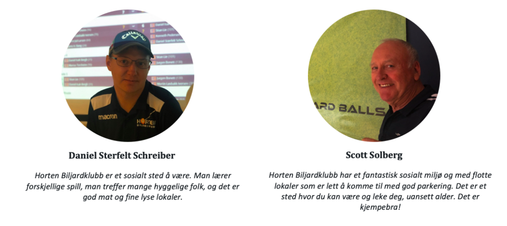 Velkommen til oss i Tomtegata 4, 3188 Horten. Her spilles det biljard på alle nivåer, og vi har medlemmer i alle aldre. Med våre store, lyse lokaler ønsker vi deg velkommen til en hyggelig dag med biljard, snooker, shuffleboard, darts og andre festligheter.